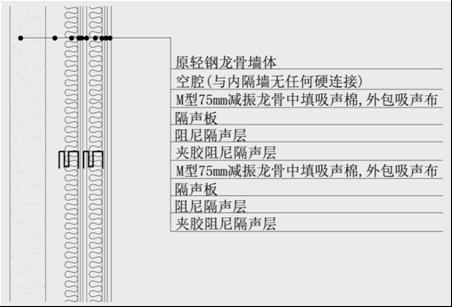 墻體的隔聲構(gòu)造均采用下圖結(jié)構(gòu)。該結(jié)構(gòu)使用75毫米寬M型低頻減振龍骨,同時(shí)安裝吸聲棉以及阻尼隔聲層等等,采用此結(jié)構(gòu)墻體的隔聲量在Rw+C大于50dB以上,隔聲部位占用地面寬度不高于375px。